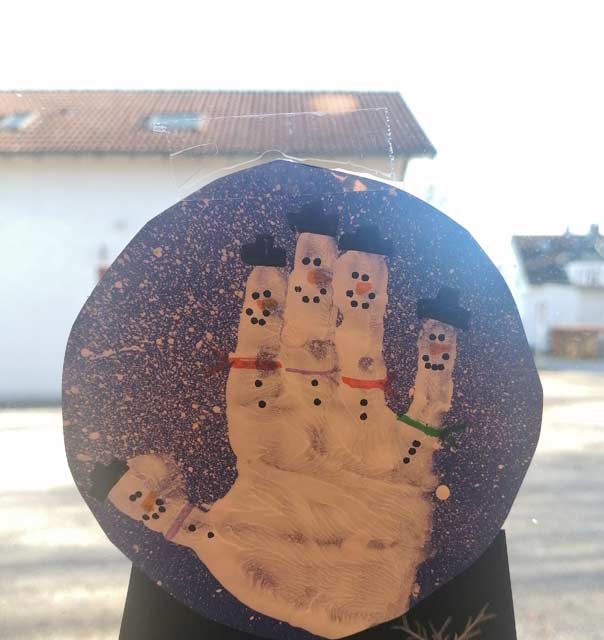Passend zu den ersten Schneeflocken, basteln wir eine Schneekugel aus Handabdrücke und singen das Lied „Es schneit, es schneit“